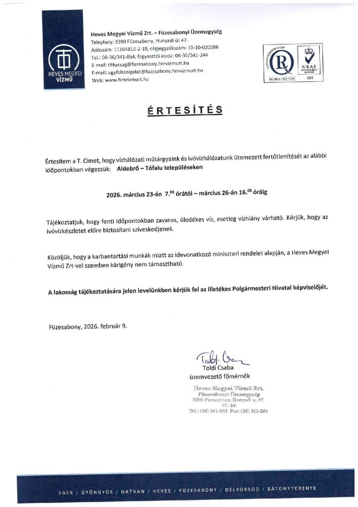 A Heves Megyei Vízmű Zrt. tájékoztatása